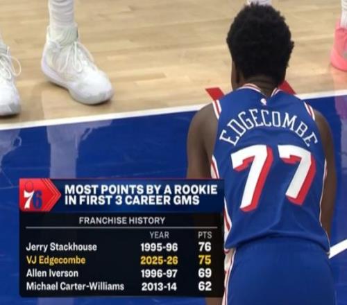 同時(shí),埃奇庫(kù)姆也打破艾弗森的紀(jì)錄,成為76人隊(duì)史前三場(chǎng)比賽得分第二多的球員。
