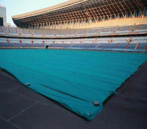 為保證草皮溫暖過冬,濟南奧體中心在冬季為球場鋪上無紡布保暖