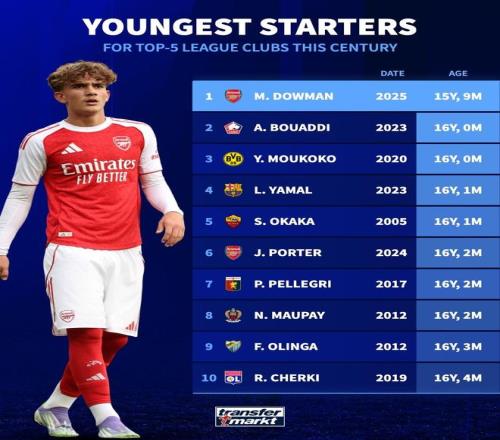 德轉(zhuǎn)列本世紀(jì)五大聯(lián)賽俱樂(lè)部最年輕的首發(fā)球員榜單,阿森納的道曼以15歲零9個(gè)月排名榜首。